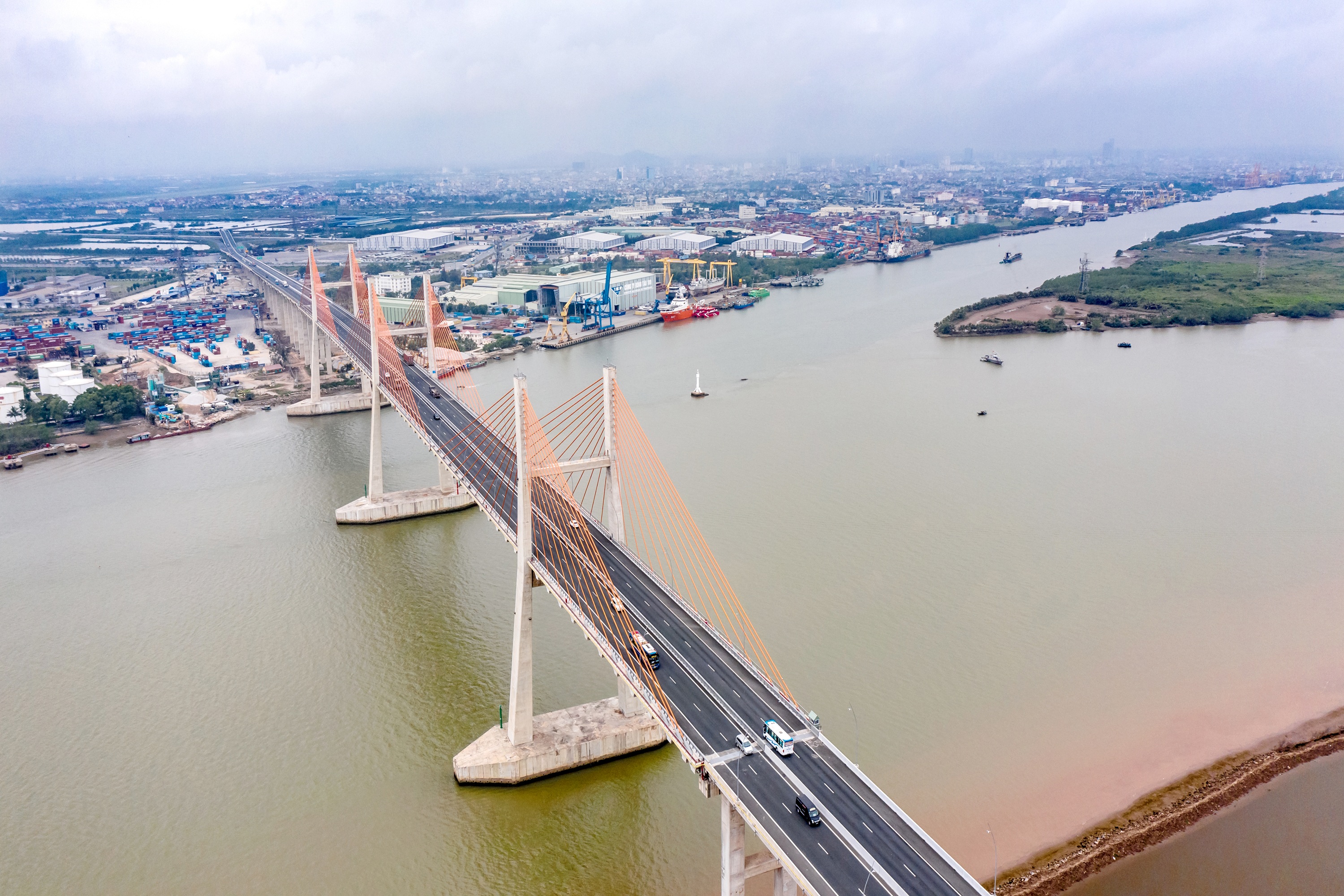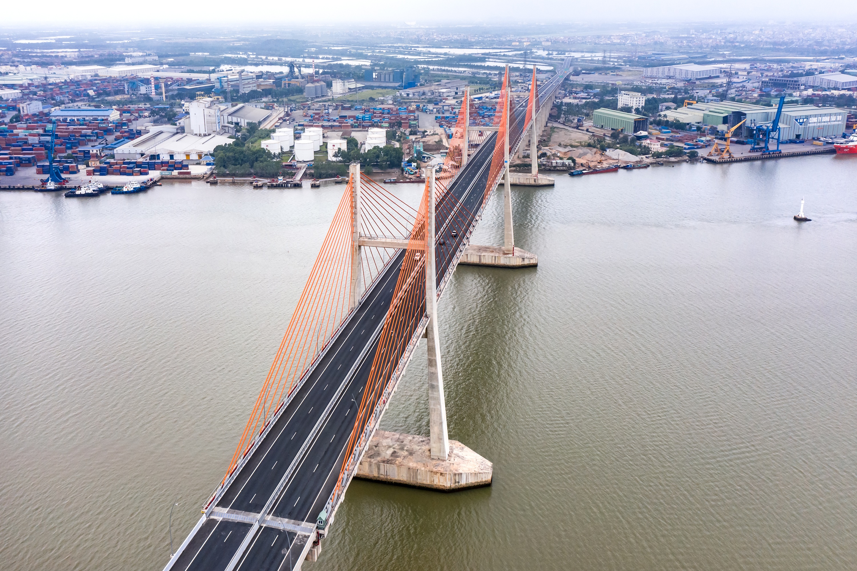 • - Cầu có 3 trụ tháp, đường dẫn hai bên cầu dài 2,357km.